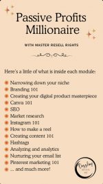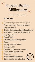 Unlock financial freedom with ‘Passive Profits Millionaire,’ a groundbreaking digital marketing course with Master Resell Rights. This unique license not only empowers you to master digital marketing but allows you to resell this invaluable knowledge for 100% profit, creating a passive income stream. Dive into exclusive modules, providing fundamental tools for building a thriving online business. With a focus on leveraging social media, the course offers prebuilt sales funnels, allowing you to focus on mastering essentials. Explore topics such as branding, niche discovery, and driving targeted traffic. ‘Passive Profits Millionaire’ is your gateway to transforming digital marketing knowledge into sustainable wealth.
